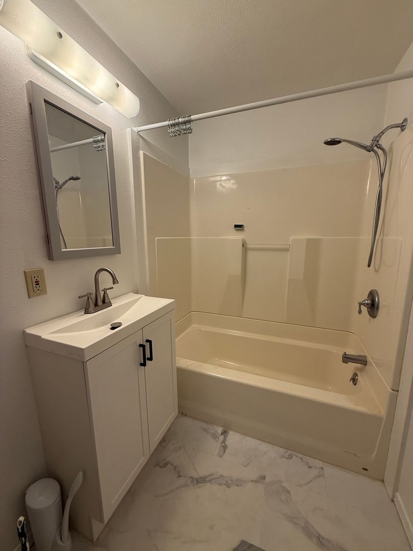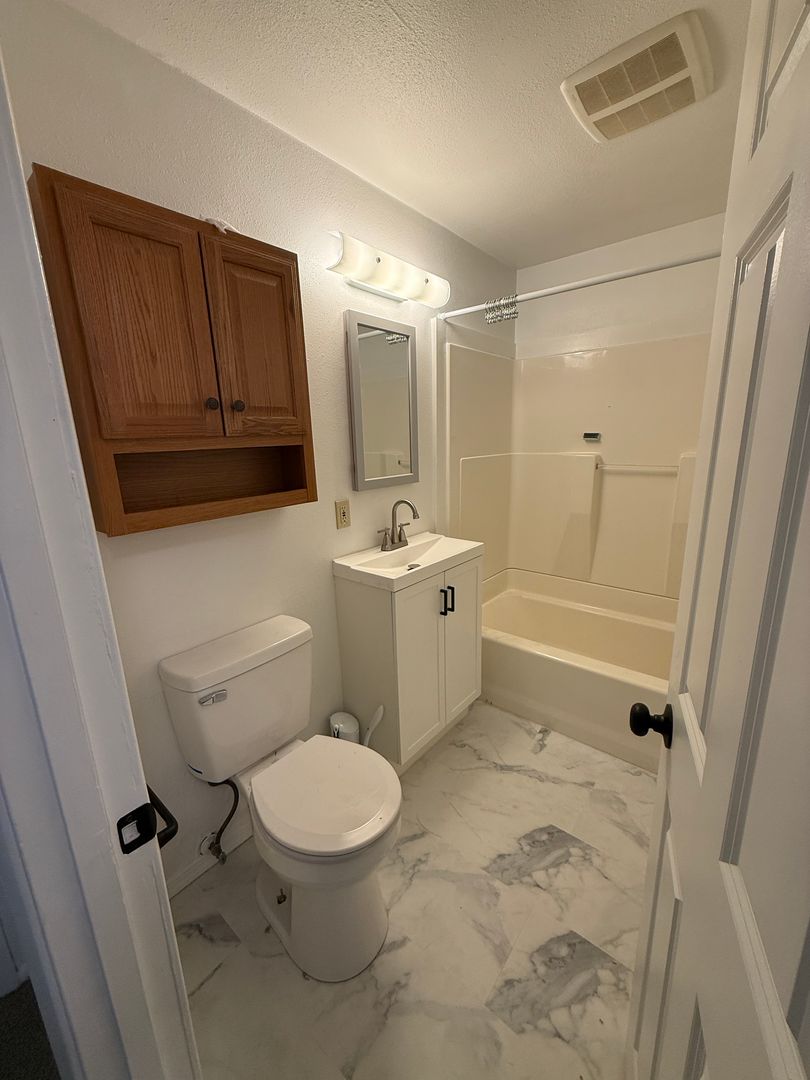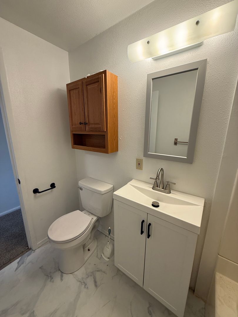 - Newly renovated bathroom with new flooring, vanity, and sink